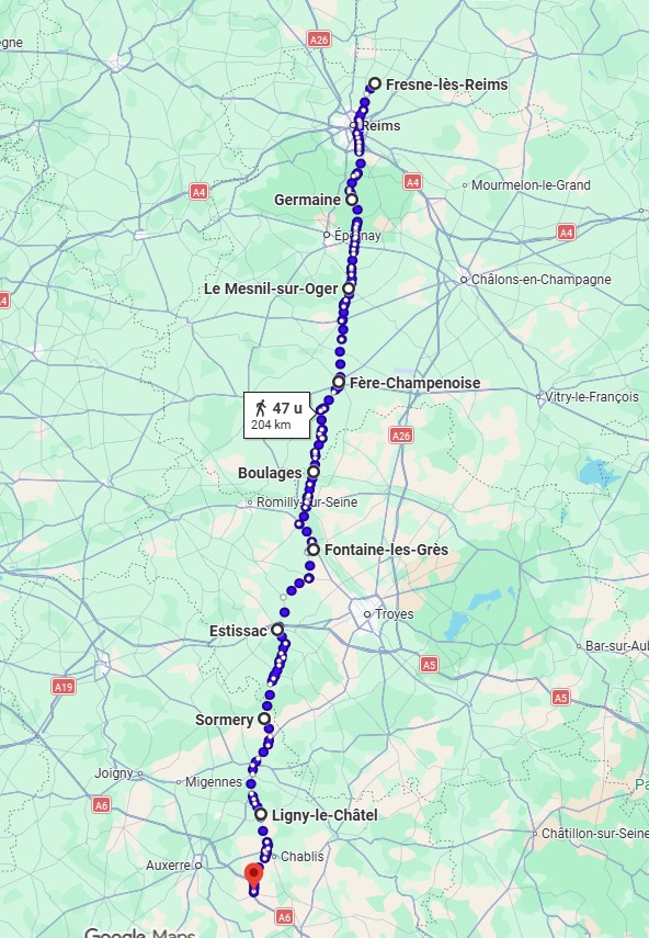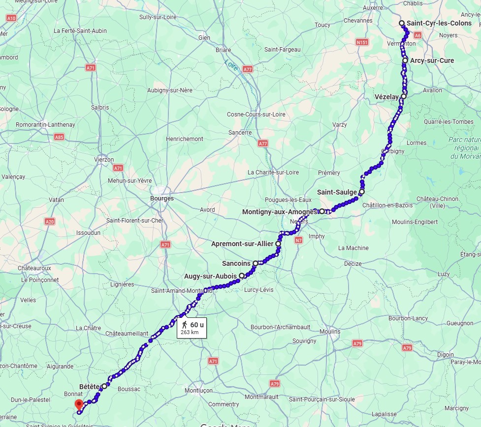 Die dag hadden we een serieuze afstand afgelegd van Vézelay, over l'Étang, Fontenay, Nuars, Vignol, Monceaux-le-Comte, Courcelanges, Chitry-les-Mines naar Chaumot , +/- 27 km.