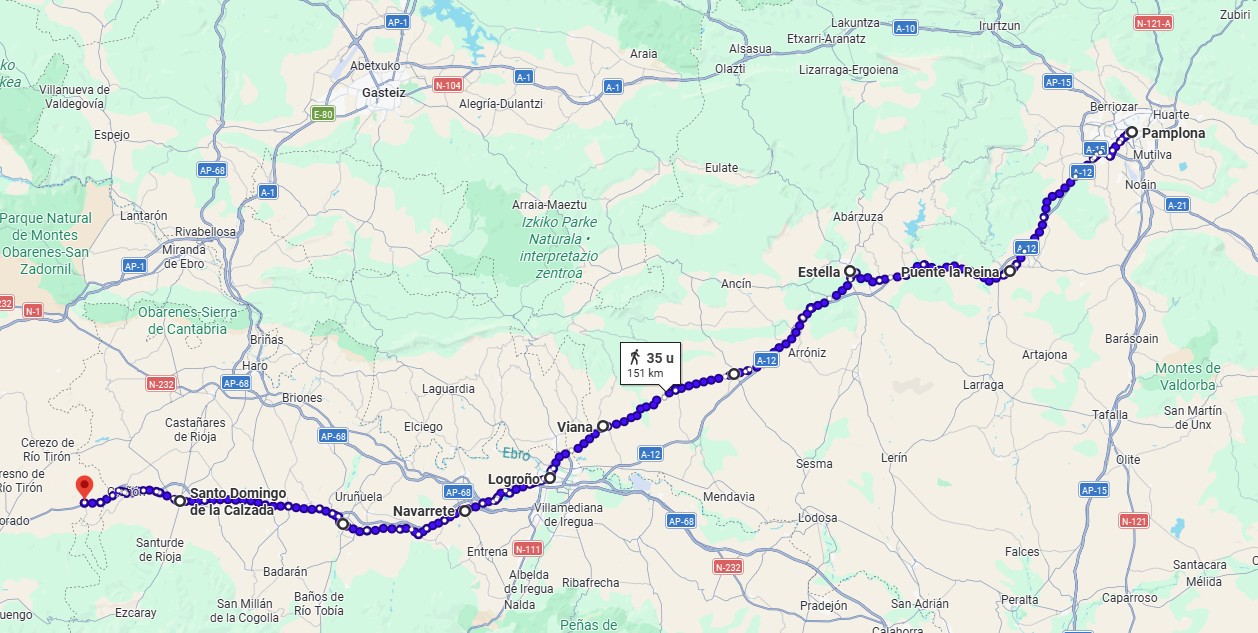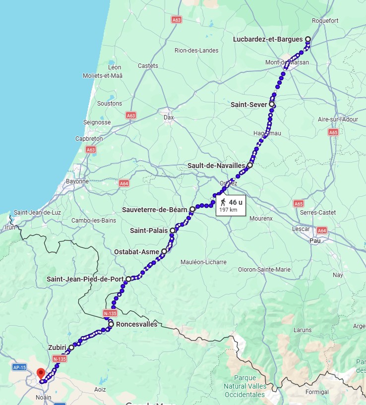 Van Saint-Jean-Pied-de-Port naar Roncesvalles klimmen we over een afstand van 20 km van 181 m tot 1430 m hoogte om dan weer snel af te dalen tot 893 m.