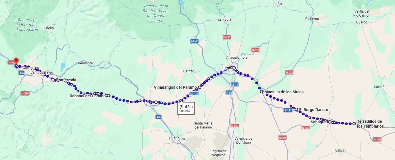 De kathedraal van Astorga – gotisch van constructie en Renaissance van afwerking krijgt onvoldoende tijd – 't is zondag – mis – en telefoneren – een lange étappe.